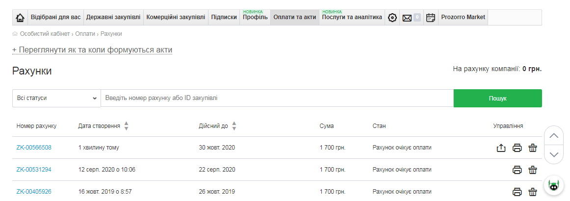 Сформований рахунок буде доступний у вкладці “Рахунки” розділу “Оплати та акти”, де можна переглянути його статус, кінцевий термін сплати, суму, завантажити, роздрукувати чи видалити.