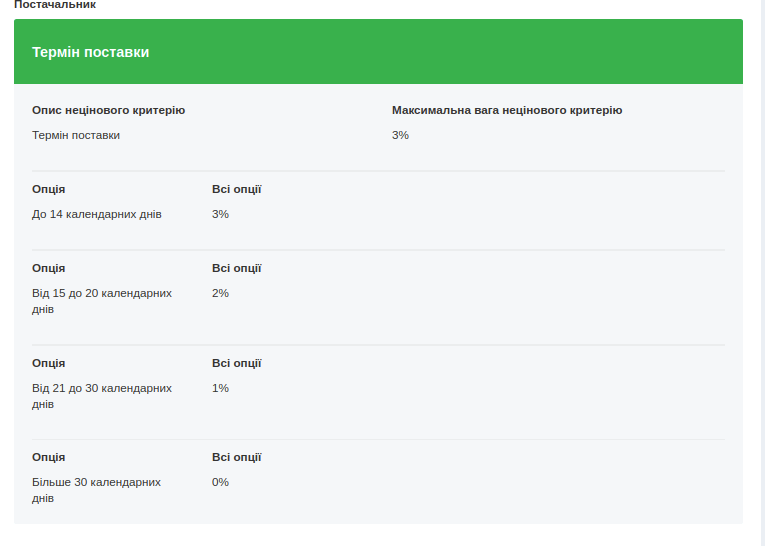 Нецінові критерії замовника можуть бачити всі постачальники, які переглядають тендер.