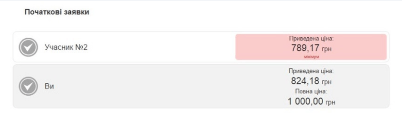 Зниження в аукціоні буде відбуватися саме за “приведеною ціною”. Основна відмінність аукціону за “приведеною” ціною від звичайного лише в тому, що постачальники бачать не фактичні ціни інших учасників, а приведені. Фактичну ставку ви бачите тільки свою.