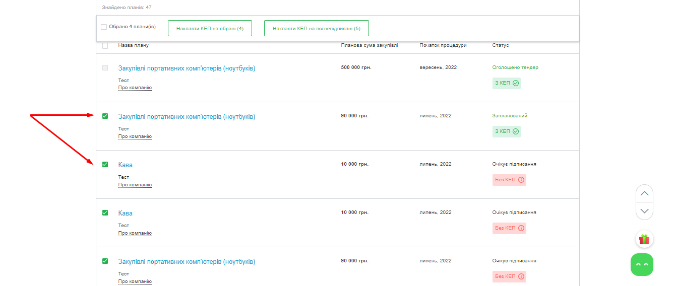 Якщо ви публікуєте декілька планів / закупівель за один раз, вам у нагоді стане можливість накласти КЕП одночасно на декілька планів / закупівель. Це зекономить вам час та зусилля.
