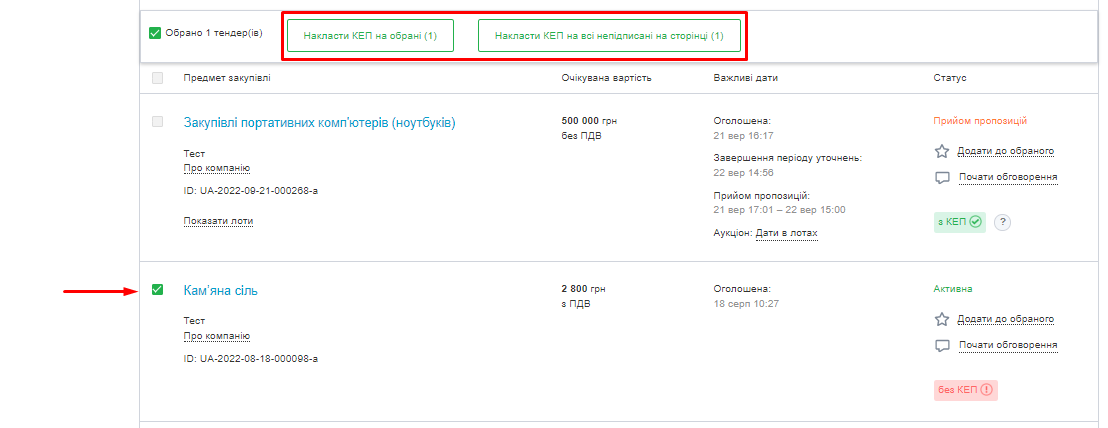 Щоб підписати декілька закупівель, перейдіть у розділ “Публічні закупівлі”, далі “Закупівлі” та оберіть вкладку “Мої закупівлі” (для ролі менеджер) або “Всі закупівлі” (для ролі адміністратор). Виберіть потрібні закупівлі та натисніть кнопку “Накласти КЕП на обрані”. Також ви можете накласти КЕП на всі непідписані закупівлі на сторінці.