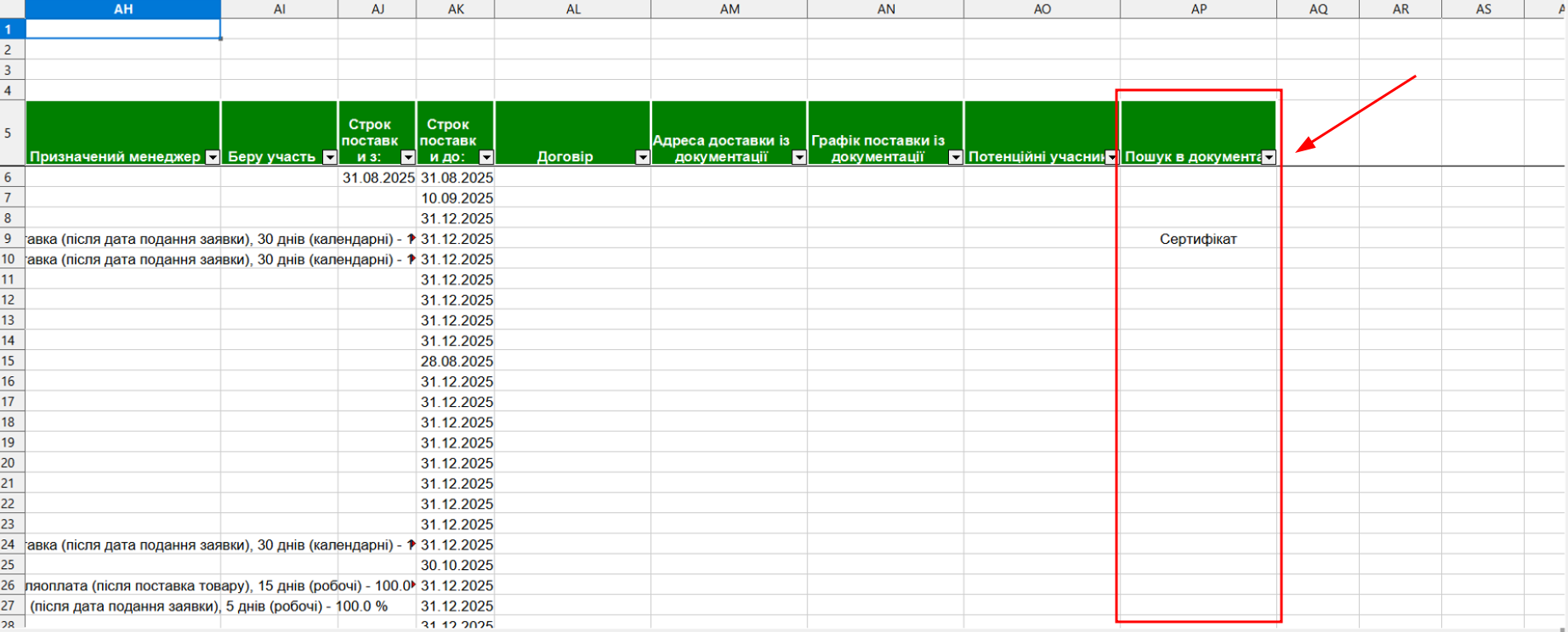 Якщо ви сформуєте список в Excel, а потім відкриєте завантажений файл, то ви побачите окремий стовпчик – Пошук по документах. У комірці буде відображатись пошуковий запит, якщо він міститься в тендерній документації відповідної закупівлі.