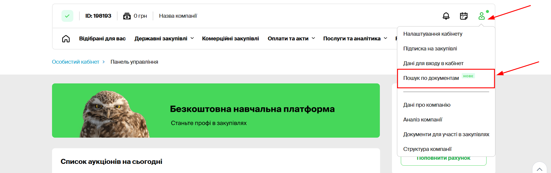 1. В правому верхньому куті кабінета натисніть на позначку користувача і далі – Пошук по документах.
