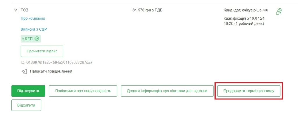 - В блоці інформації про пропозицію учасника, щодо якої будете робити продовження, натисніть кнопку “Продовжити термін розгляду”.