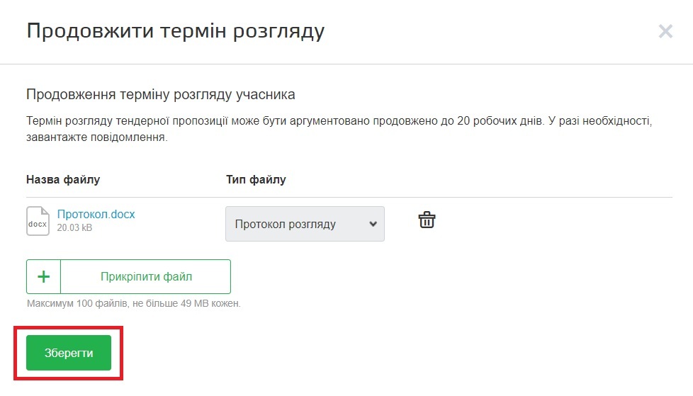 - Завчасно підготуйте протокол та повідомлення про продовження строку розгляду тендерної пропозиції або лише протокол, якщо зазначити в його тексті, що він і є повідомленням.