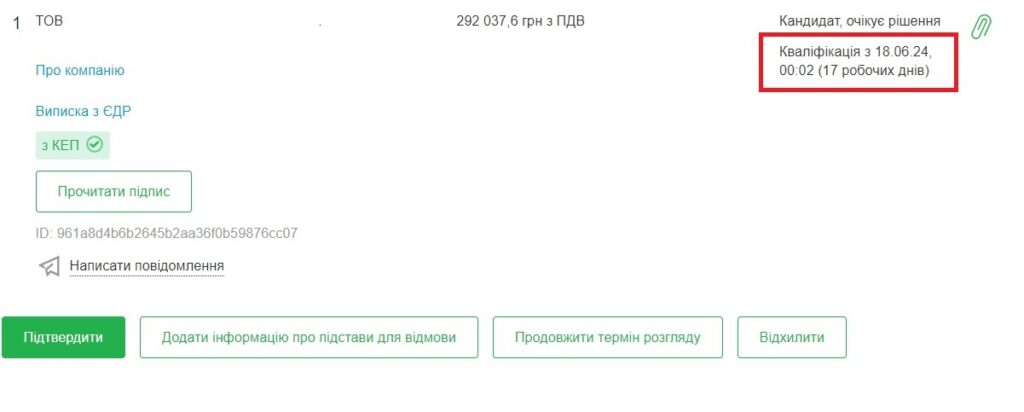 Зверніть увагу, що система не буде відображати інформацію про те, яка дата у вас буде кінцевою для кваліфікації. В блоці інформації про пропозицію учасника буде відображатись лише загальна кількість днів, що минула з дня розкриття тендерної пропозиції.
