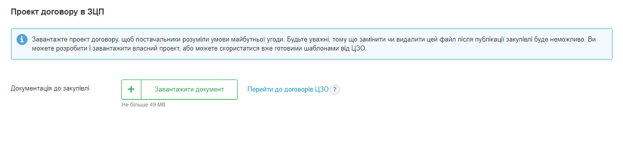 Зверніть увагу, що запит ціни пропозиції не передбачає наявності документації до закупівлі з технічними вимогами, критеріями для оцінки учасника тощо. Тому в цьому розділі можливо завантажити лише один файл і це має бути саме проєкт договору. Будьте уважні, тому що після публікації і підписання закупівлі замінити чи видалити файл буде неможливо.