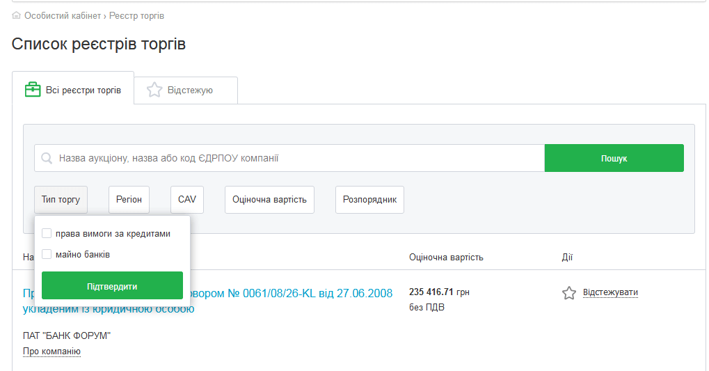 Щоб переглянути реєстр, перейдіть до кабінету до розділу Аукціони – Реєстр торгів.