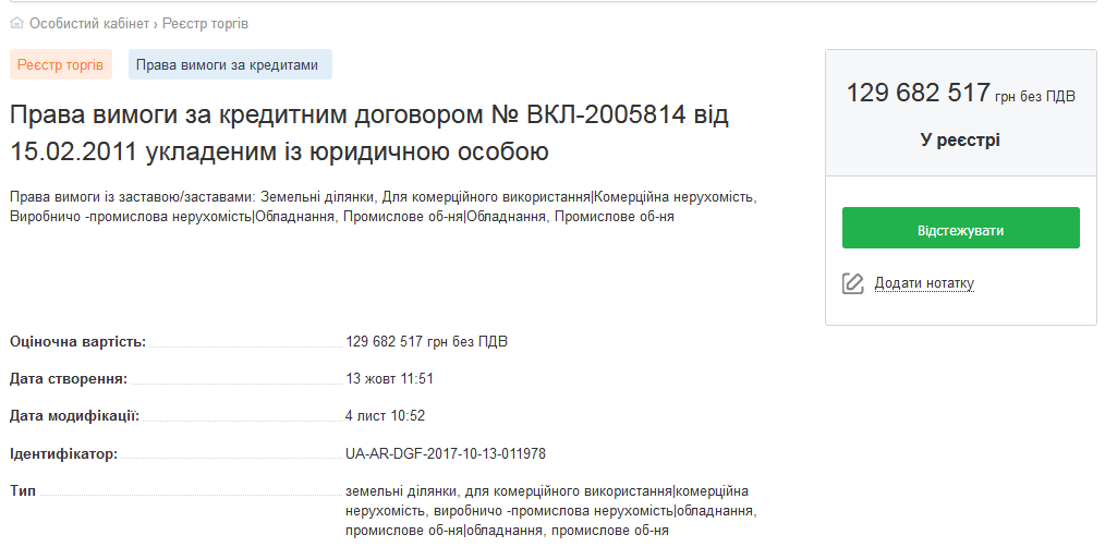 На сторінці торгів у реєстрі вказано наступну інформацію: