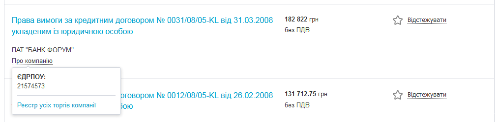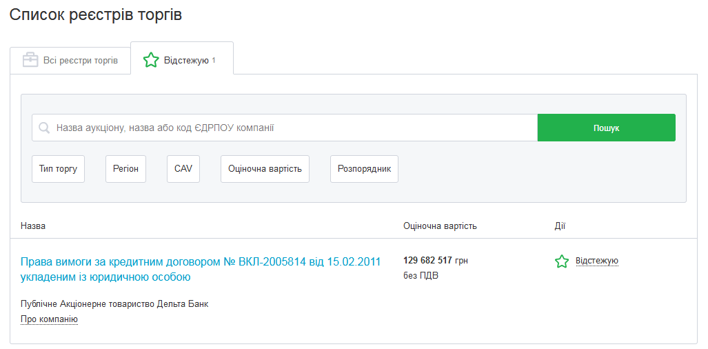 - Інформація про розпорядника торгів: повна юридична назва, ЄДРПОУ та юридична адреса.Щоб не прогавити оголошення процедури з торгів, що зареєстровані у реєстрі і які вас зацікавили, натисніть “Відстежувати”. Усі помічені таким чином торги будуть відображатися на сторінці реєстру у розділі “Відстежую”.
