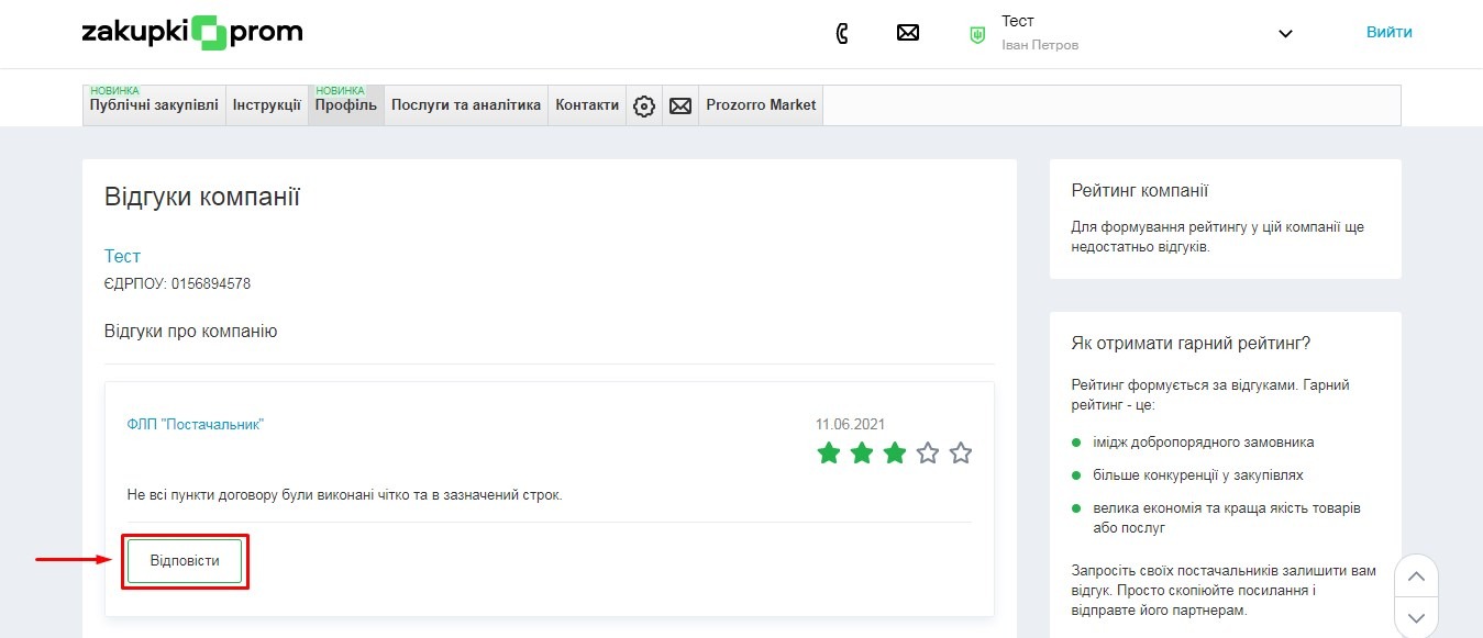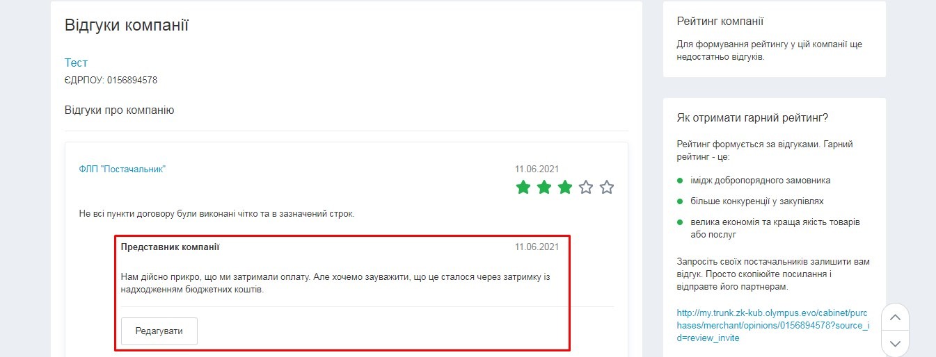 У вас також є можливість відповісти на відгук. Наприклад, пояснити, чому виникла та чи інша ситуація у разі незадоволеності контрагента. Це продемонструє, що вам не байдуже, і ви дійсно прагнете до взаємовигідної співпраці.