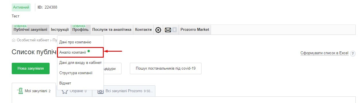 1. Перейдіть в особистому кабінеті у розділ “Профіль” – “Аналіз компанії”.