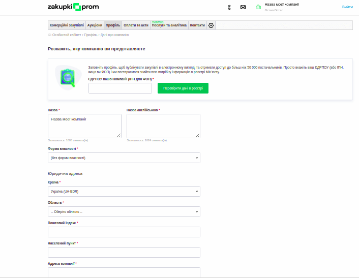 • після заповнення профілю компанії ви зможете оголошувати закупівлі.