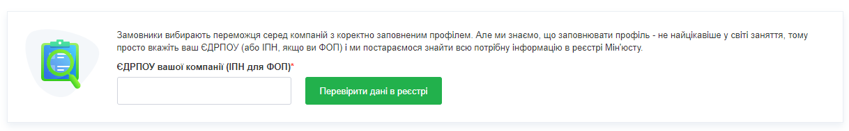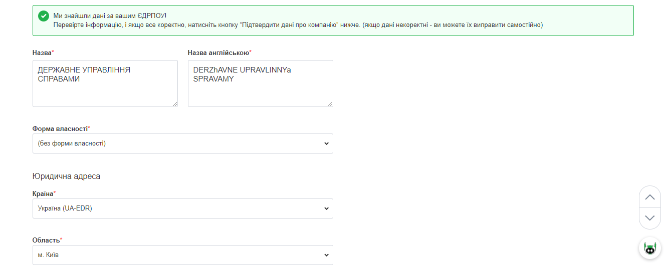 2. Щоб швидше заповнити дані про компанію, зазначте ЄДРПОУ вашої юридичної особи, натисніть “Перевірити дані в реєстрі”, і поля будуть автоматично заповнені.