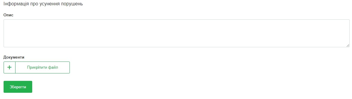 Потрібно заповнити поле “Опис” і, за бажанням, прикріпити файл, а після збереження скористатись КЕП. Після цього на сторінці моніторингу з’явиться новий блок “Інформація про усунення порушень” де, за потреби, ви можете завантажити нові файли за допомогою кнопки “Оновити документи”.