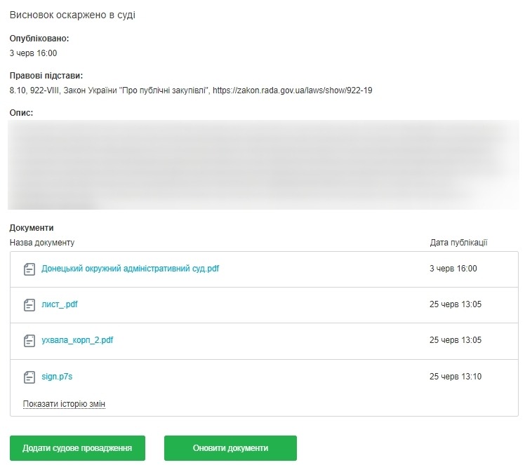 Після цього на сторінці моніторингу у замовника з’явиться розділ “Висновок оскаржено в суді”, в якому будуть кнопки “Додати судове провадження” та “Оновити документи”. Далі потрібно застосувати КЕП.
