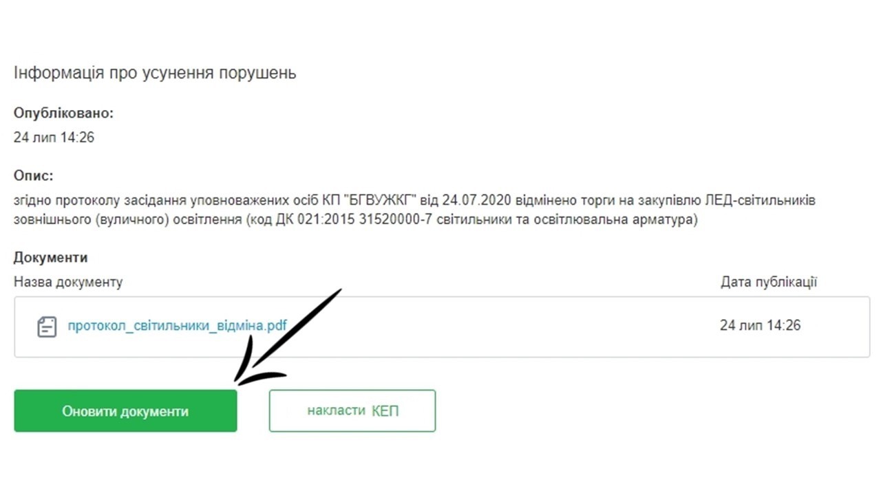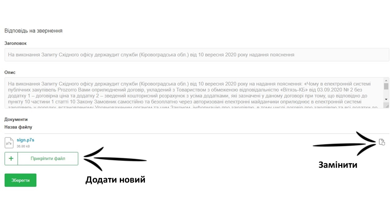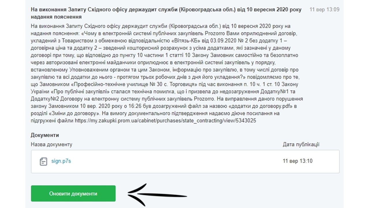 За потреби, після надання відповіді замовник може її доповнити натиснувши на кнопку “Оновити документи”. Варто зазначити, що інформацію, яка була внесена текстом в поля “Заголовок” і “Опис”, змінити буде неможливо. Замовник зможе тільки замінити раніше завантажений файл або додати новий.