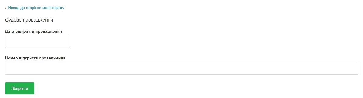 Протягом наступного робочого дня з дня отримання інформації про відкриття провадження, замовнику потрібно натиснути кнопку “Додати судове провадження” та вказати дату відкриття такого провадження і його номер.”