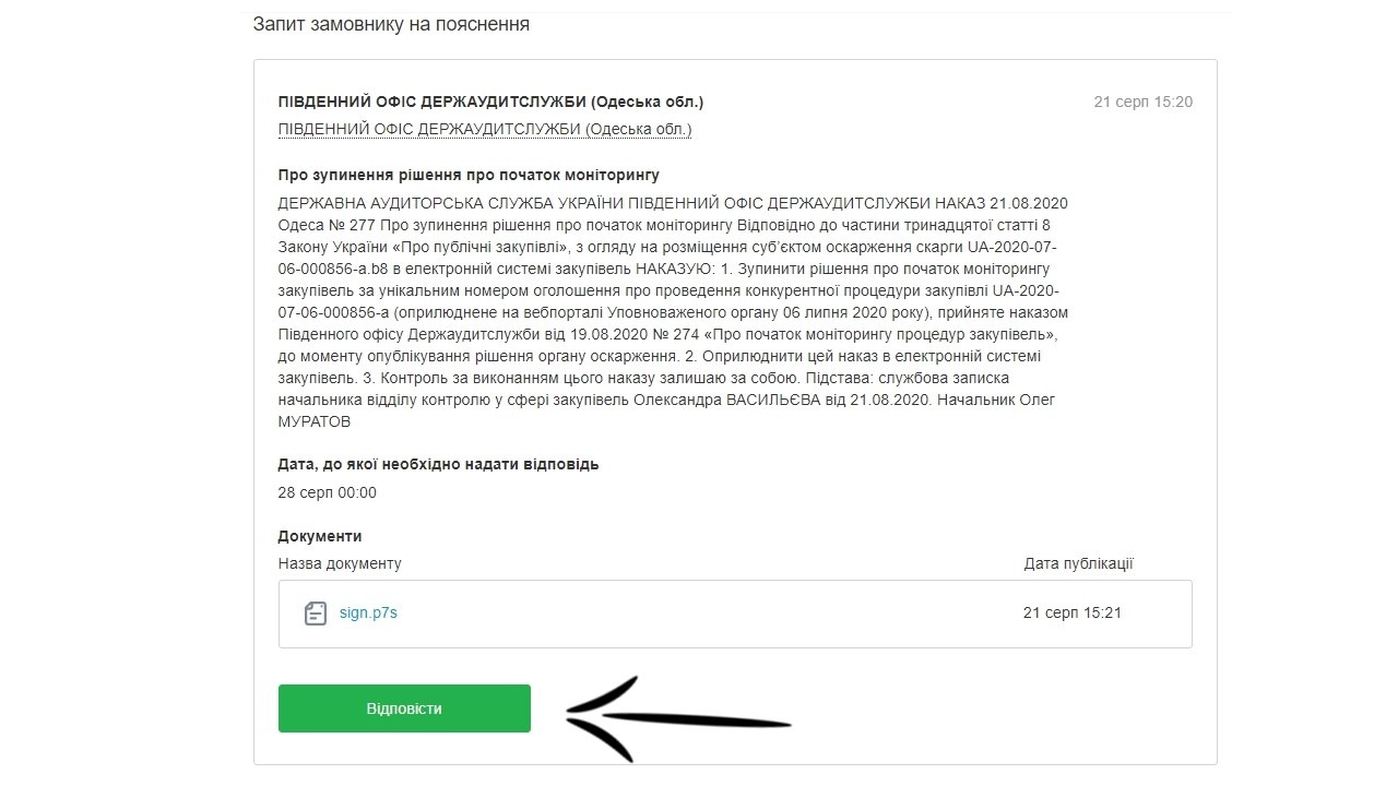 Після внесення інформації потрібно скористатися КЕП. На сторінці моніторингу з’явиться розділ “Звернення за роз’ясненнями щодо висновку”, в якому буде опублікована відповідь співробітника ДАСУ щодо запиту замовника: