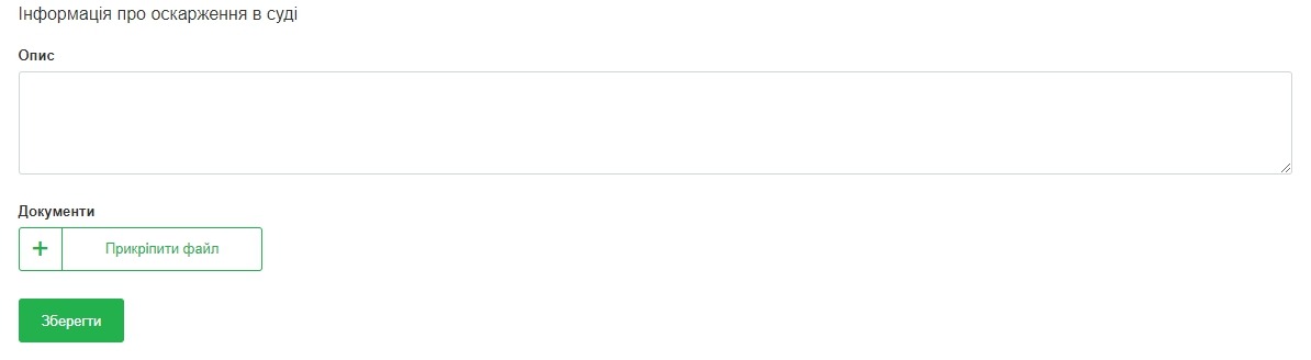 Після подання позовної заяви до суду, протягом 1 робочого дня замовнику потрібно натиснути кнопку “Оскаржено в суді”, внести інформацію щодо подання позовної заяви (за бажанням, можна завантажити файл).