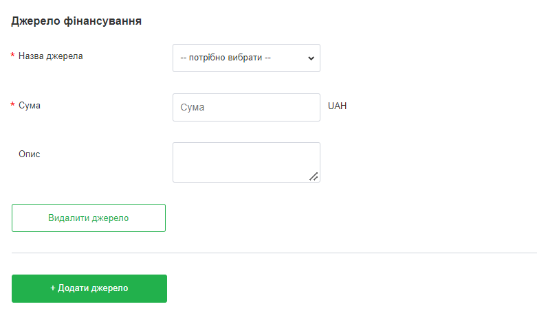 9.  Далі потрібно вказати джерело фінансування, його назву та суму. За потреби можна додати опис. Якщо джерел фінансування декілька, натисніть на кнопку “Додати джерело”.