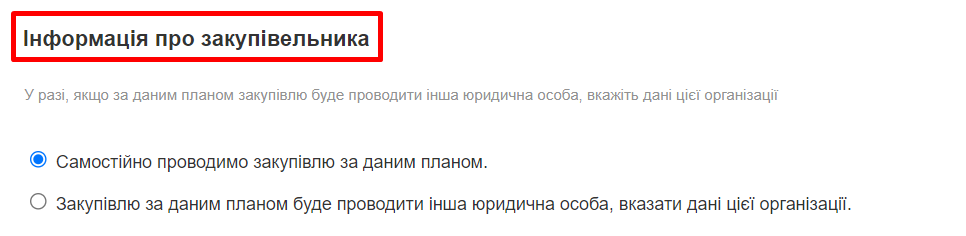 У разі, якщо за даним планом закупівлю буде проводити інша юридична особа, то поставте галочку у відповідному рядку та заповніть дані організації, яка буде проводити закупівлю за даним планом.