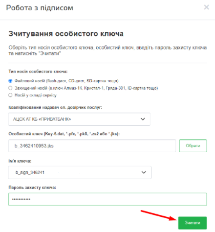 Для підписання КЕП, заповніть необхідні поля та натисніть “Зчитати”.
