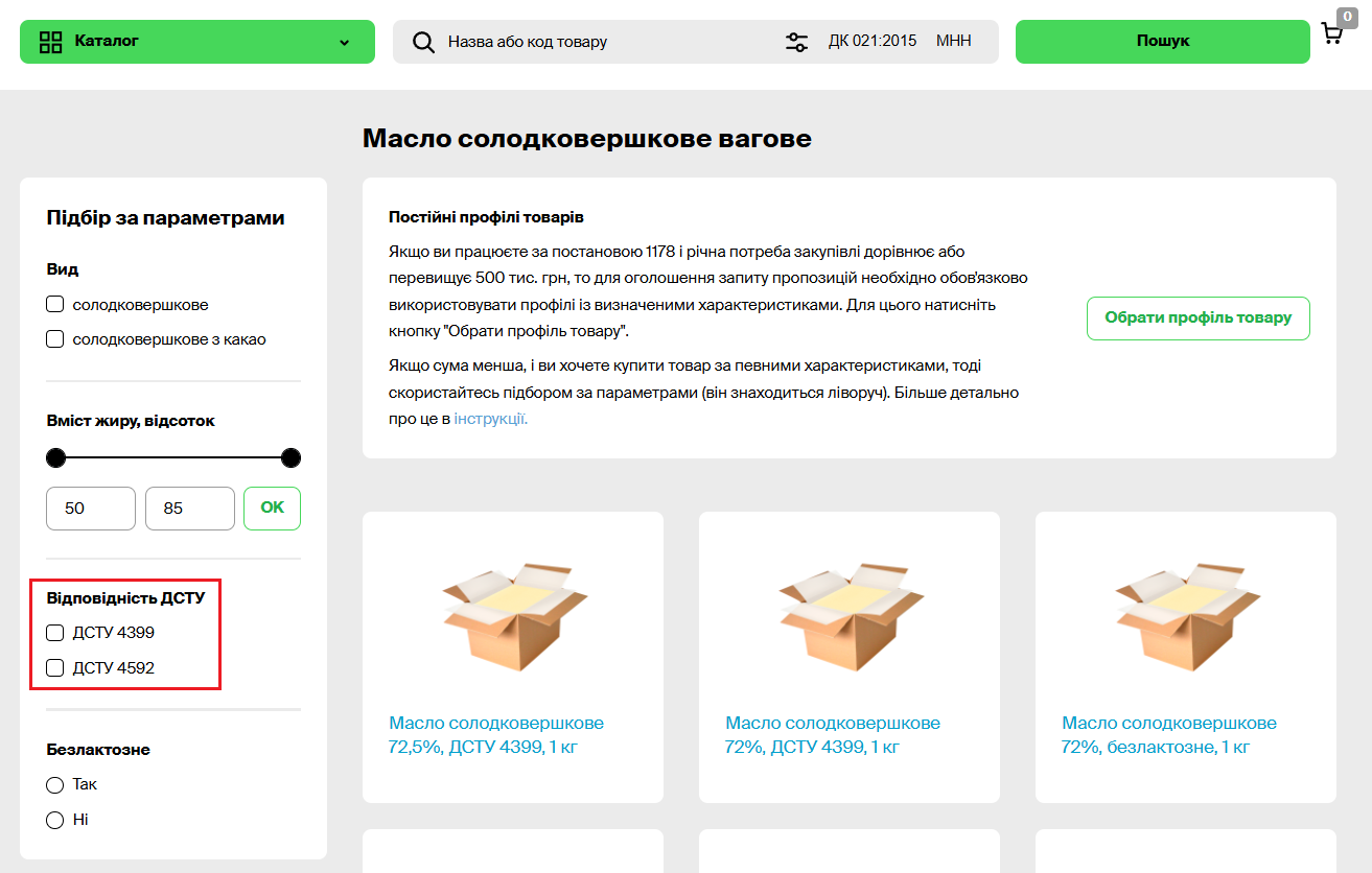 Відповідно до діючих стандартів які встановлені законодавством України, вершкове масло має відповідати ДСТУ 4399:2005. Тобто, учасник, який подає свою заявку про приєднання до каталогу підтверджує, що його продукція відповідає цим стандартам. Тож дана норма врахована в електронному каталозі.