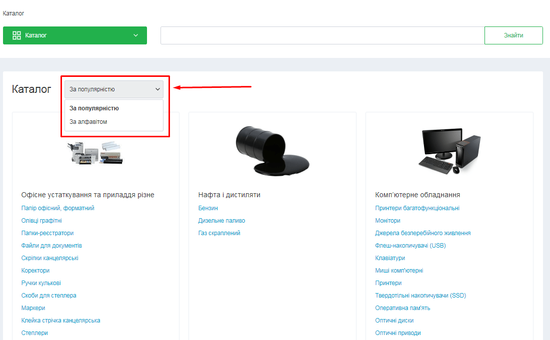 У вас є можливість відсортувати товарні пропозиції за популярністю та за алфавітом (найбільш популярна категорія – це категорія з найбільшою кількістю замовлень).
