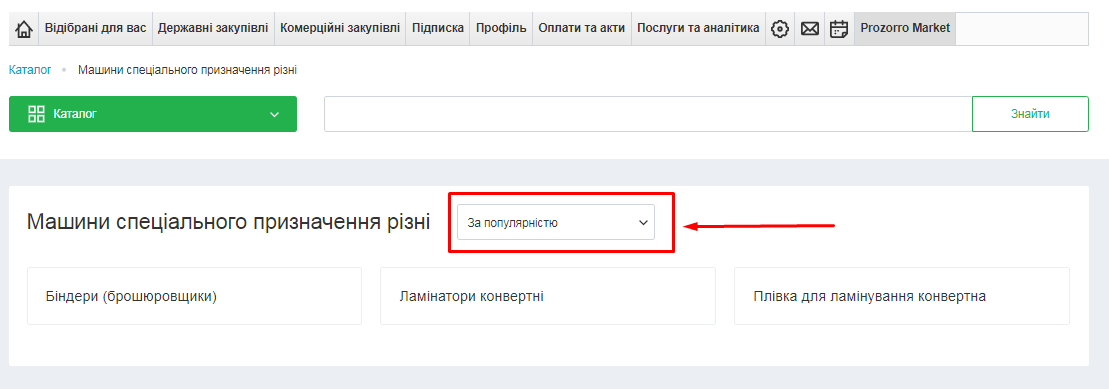 Сортування категорій дозволяє вам простіше орієнтуватися в електронному каталозі Prozorro Market.