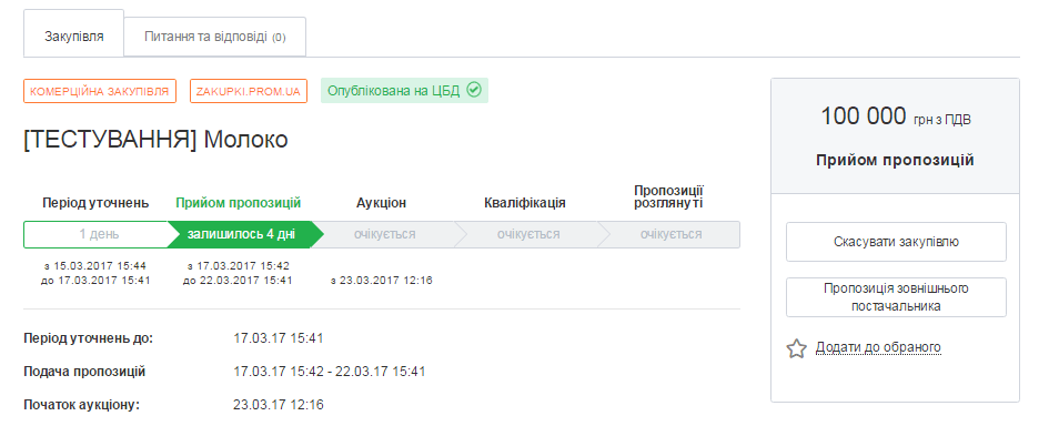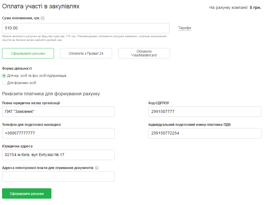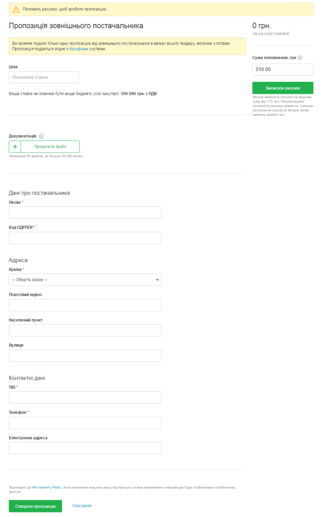 Зверніть увагу, постачальник бере участь в закупівлі на таких же умовах, що й інші учасники. Тому оплата за участь знімається відповідно до тарифів системи. Якщо замовник вносить пропозицію постачальника в своєму кабінеті, то оплачує участь також замовник.