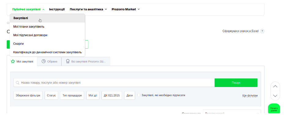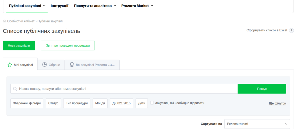 1. Для того, щоб оголосити нову закупівлю перейдіть у вкладку “Публічні закупівлі” – “Закупівлі”.