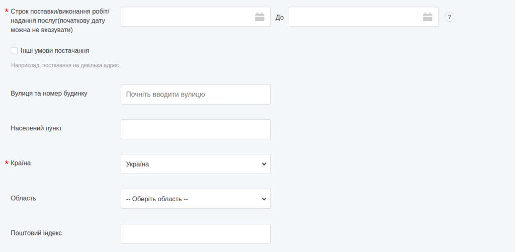 Зазначте адресу поставки товару, виконання робіт чи надання послуг. За потреби можна скористатися прапорцем “Інші умови постачання”, в такому разі в системі буде виведено повідомлення “Відповідно до документації”.