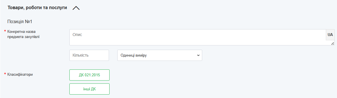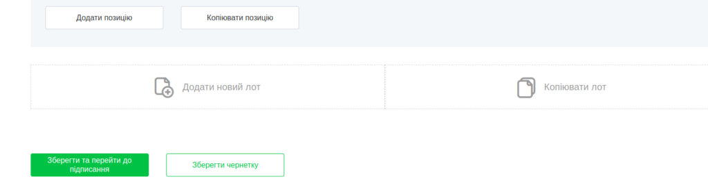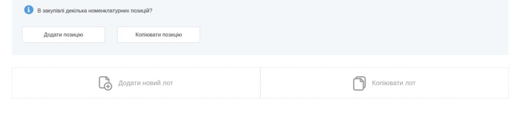 14. Якщо в закупівлі декілька номенклатурних позицій, то скористайтеся кнопкою “Додати позицію” і введіть інформацію вручну. Або кнопкою “Копіювати позицію”, тоді певні поля система заповнить автоматично відповідно до попередньої номенклатурної позиції.