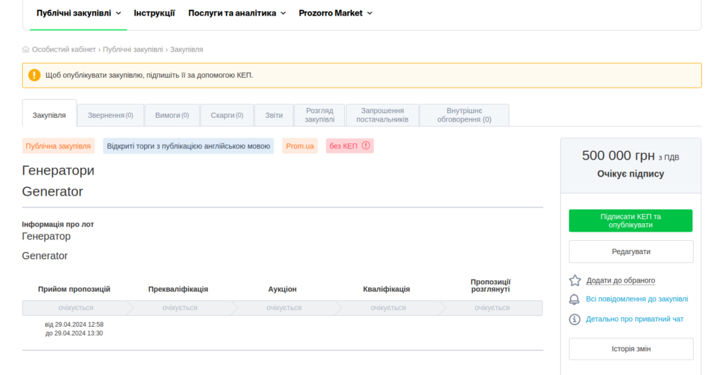 15. Коли заповнена вся інформація до закупівлі, можете скористатися кнопкою “Зберегти чернетку” і повернутися до публікації закупівлі пізніше. Або збережіть закупівлю та перейдіть до її підписання.