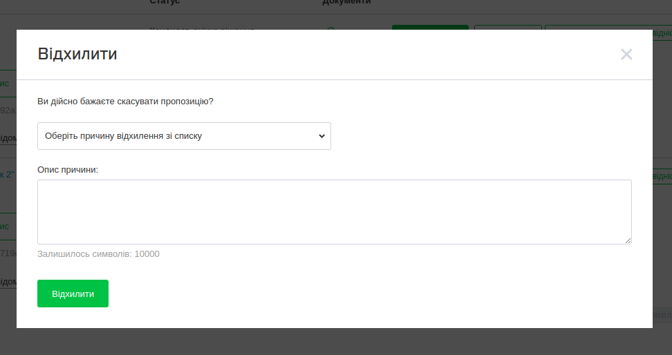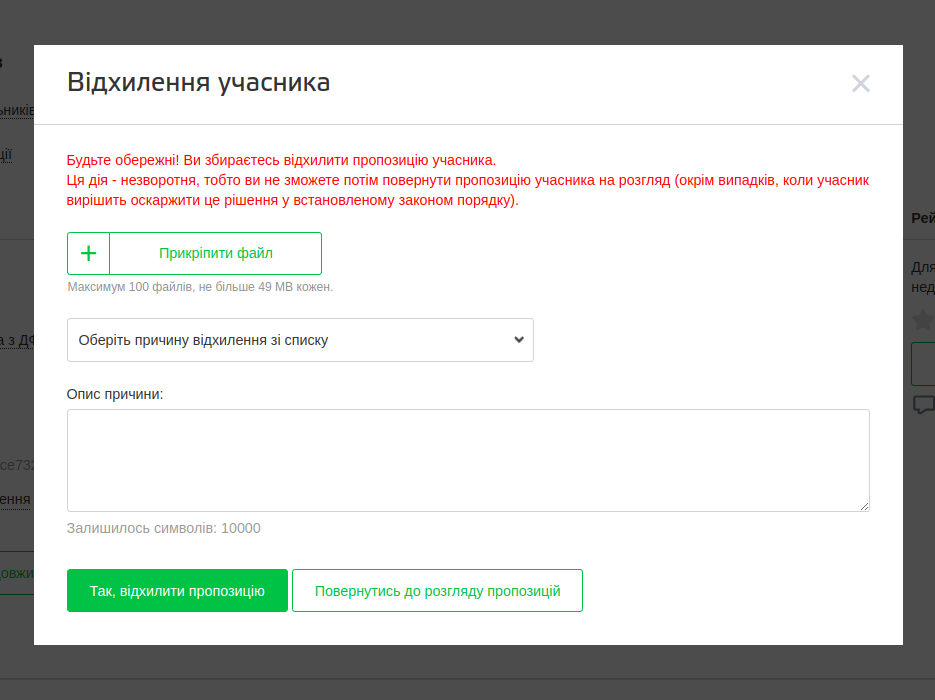 24. Для відхилення учасника скористайтесь кнопкою “Відхилити”, підготуйте протокол та опублікуйте його в системі із зазначенням причини відхилення.
