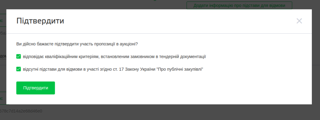 20. При підтвердженні учасника зазначте відповідність кваліфікаційним критеріям та відсутність підстав для відмови.