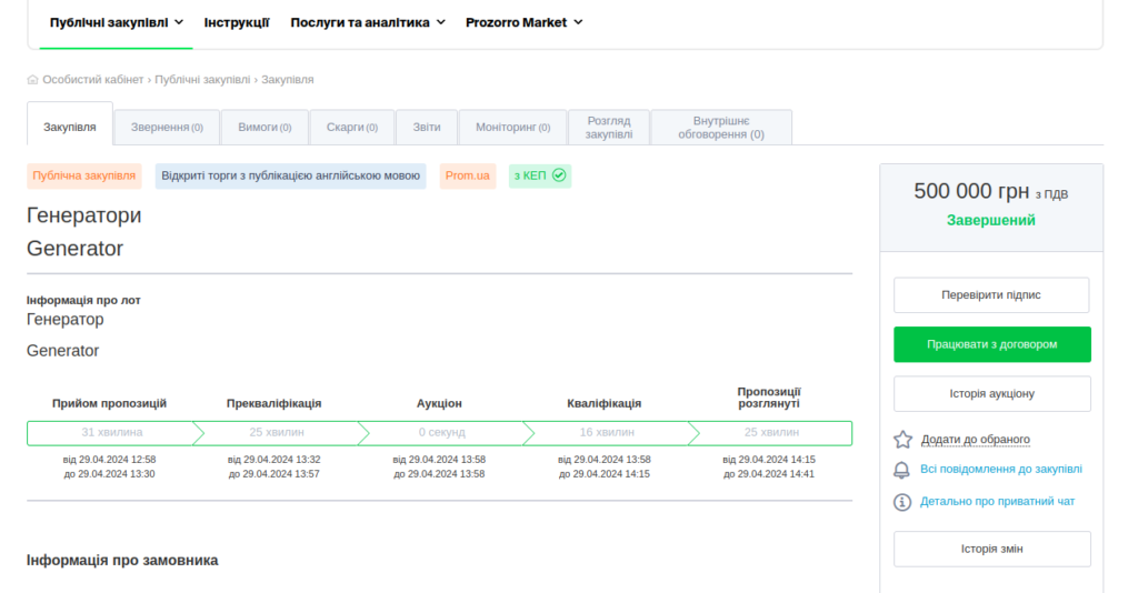 28. Закупівля перейде у статус завершеної і далі вже можна буде працювати безпосередньо з самим договором (публікувати додаткові угоди, звітувати про виконання чи розірвання договору). Для цього використовуйте кнопку “Працювати з договором”.