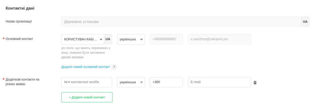 Основний контакт вказано відповідно до даних в структурі компанії. Якщо співробітників в структурі декілька, виберіть потрібні дані з випадаючого списку.
