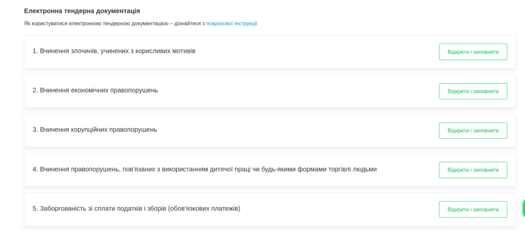 Звертаємо увагу, що відповідно до чинних особливостей проведення відкритих торгів замовник не може вимагати від учасника файли для підтвердження відсутності підстав. Тому наразі в цьому розділі вам не потрібно нічого змінювати, просто пропускаєте його і переходите далі.