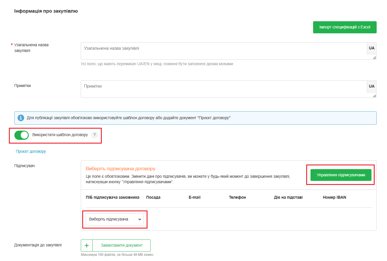 Також,  ви можете використати готовий шаблон договору. Він підтягується автоматично в залежності від товару, який ви вибрали. На цьому етапі необхідно вказати дані про підписувача договору. Якщо дані про підписувача вже були внесені, виберіть необхідного підписувача із випадаючого списку. Якщо ви вперше зазначаєте підписувача, то спочатку натисніть “Управління підписувачами” та заповніть всі необхідні поля.