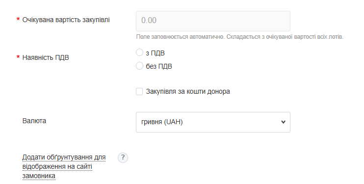 Поле “Очікувана вартість закупівлі” заблоковано і сума вираховується системою автоматично (з урахуванням сум лотів, які введе замовник нижче). Звертаємо увагу, що за замовчуванням відкриті торги – це завжди лотова закупівля (в системі за замовчуванням створено один лот).