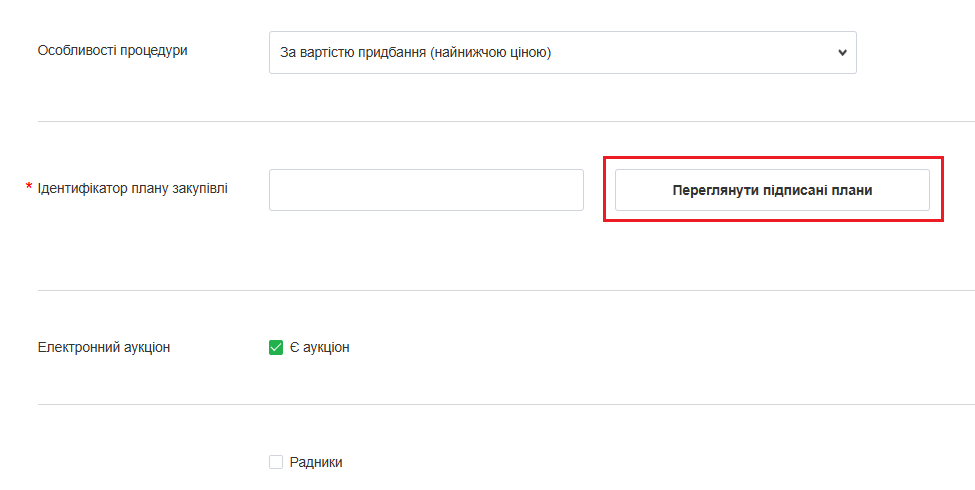 Далі, вкажіть ідентифікатор плану закупівлі вручну, або натисніть “Переглянути підписані плани” . Якщо ви оголошуєте закупівлю зі сторінки плану – ідентифікатор заповнюється автоматично.