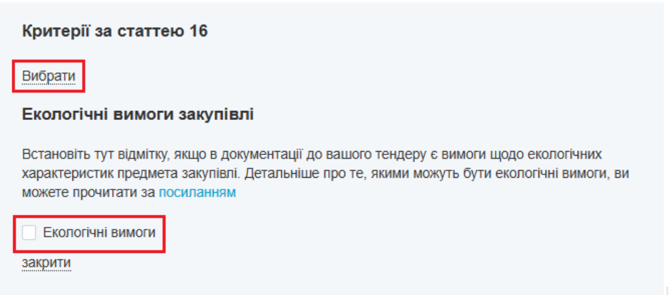 Для того, щоб встановити вимоги по кваліфікаційним критеріям натисніть кнопку “Вибрати”. Також, якщо в закупівлі передбачені “Екологічні вимоги” натисніть прапорець, та заповніть необхідне поле.