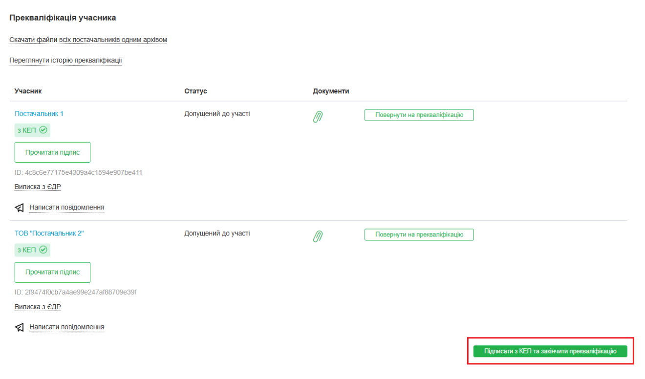 21. Після розгляду всіх учасників натисніть кнопку “Підписати з КЕП та закінчити преквафілікацію”
