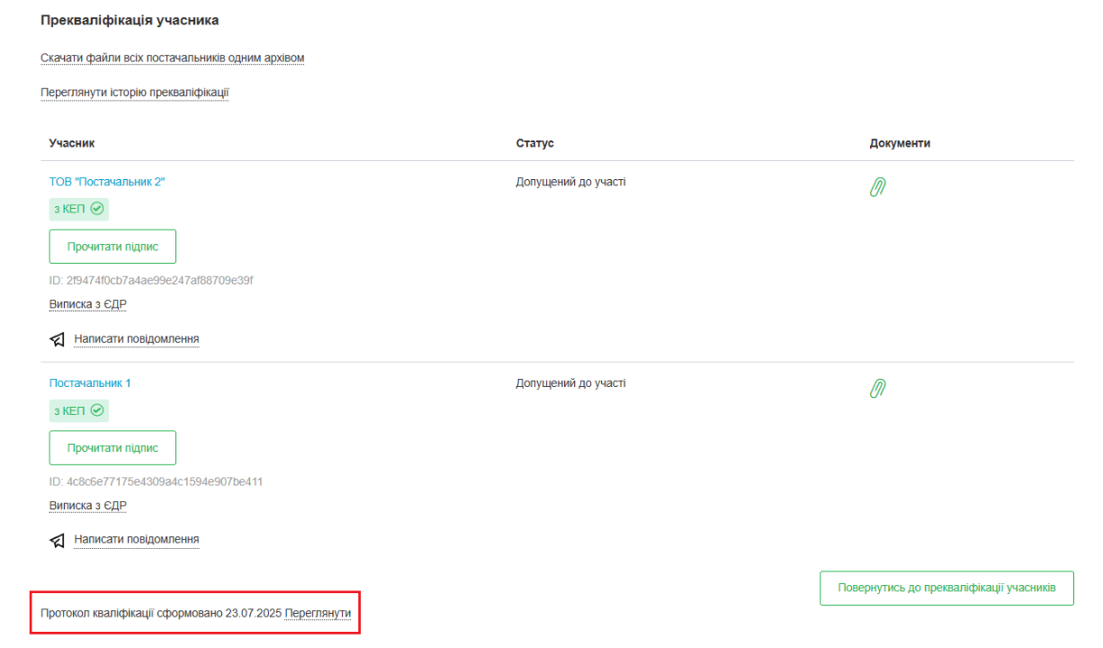 Після того, як ви підпишете рішення КЕП учасники будуть допущені до участі Також, буде сформований “Протокол кваліфікації”