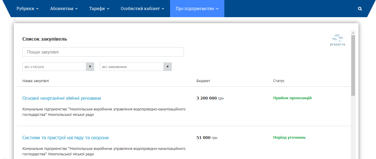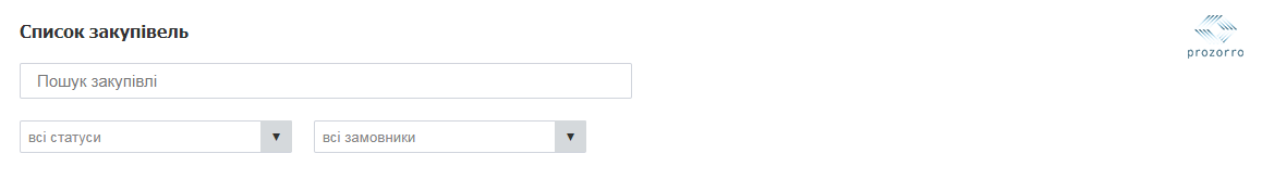 Також постачальник може скористатися строкою пошуку або відібрати закупівлі за статусом або замовником.