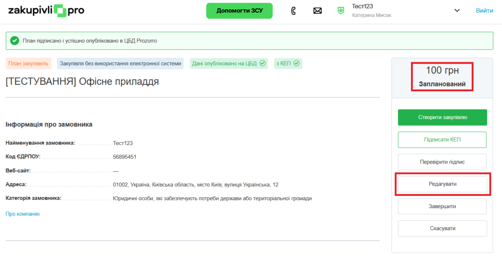 На майданчику внести зміни можна в план який має статус “Запланований”, та відредагувати необхідні поля.