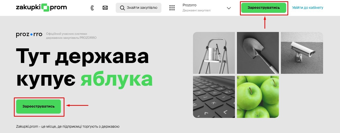 - Перейдіть на головну сторінку Zakupivli.Pro та натисніть “Зареєструватись”.