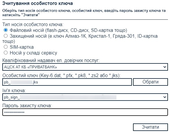 Далі у вікні, що відкриється, виберіть тип носія особистого ключа. За замовчуванням обрано “Файловий носій”. Тому якщо ваш підпис саме у вигляді файлу, вам залишається обрати його з відповідної папки на комп’ютері, вказати АЦСК, пароль та натиснути “Зчитати”.
